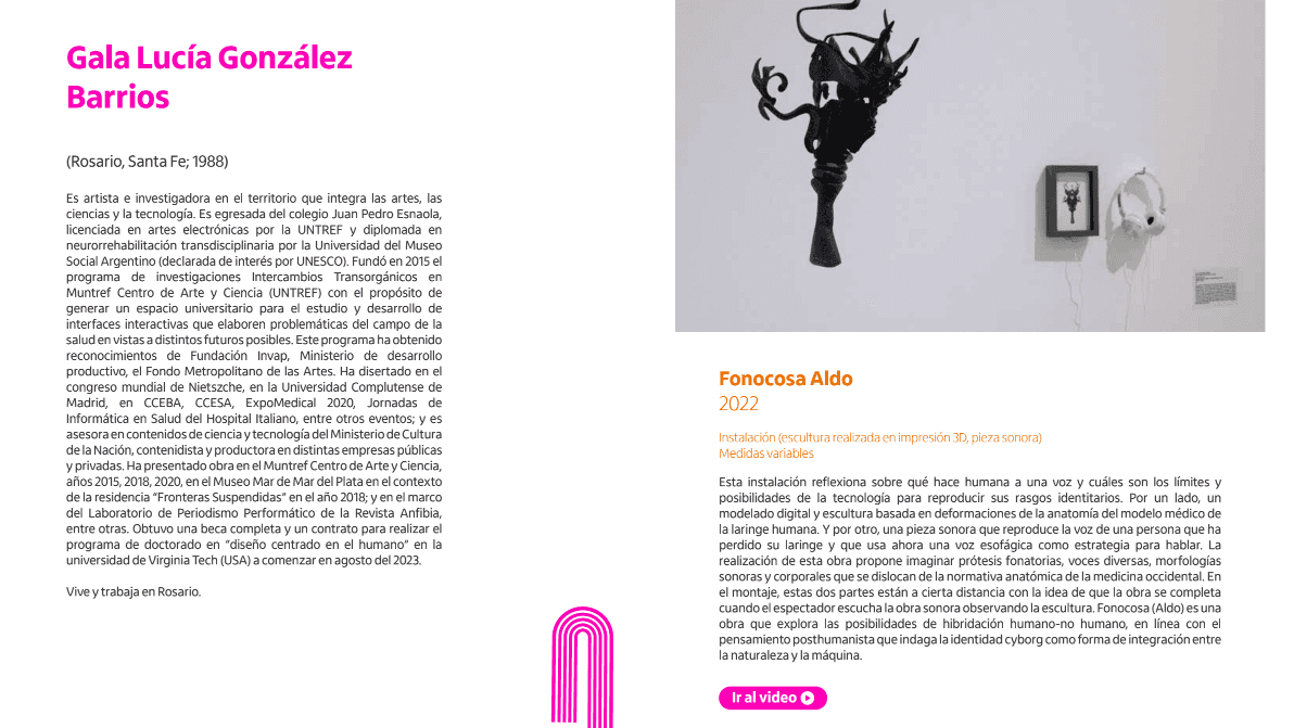 Esta instalación forma parte de una serie de experimentos artísticos realizados por nuestra directora la Lic. Gala Lucía González Barrios a partir de las preguntas que impulsan su investigación desde 2019: ¿Qué hace humana a una voz? ¿Qué la diferencia de una voz artificial? ¿Qué aspectos de la voz forman parte de nuestra identidad? ¿Cuáles son los límites y posibilidades de la tecnología para reproducir los rasgos identitarios de una voz humana? Fonocosa Aldo es por un lado un modelado digital e impresión 3D basado en deformaciones de la anatomía de la laringe humana. Y por otro, una pieza sonora que reproduce la voz de una persona que ha perdido su laringe y que usa ahora una voz esofágica como estrategia para producir una nueva voz. Esta voz es difícil de escuchar y esta población reporta sistemáticamente un rechazo social que experimentan por las características de su sonido particular. La realización de esta obra tiene como objetivo el ejercicio de imaginar prótesis fonatorias, voces diversas, morfologías sonoras y corporales que se dislocan de la lógica normativa de los cuerpos y sus experiencias, a su vez dialoga con la idea de incorporar lo monstruoso. Esta instalación tiene varias propuestas de montaje, aunque la ideal es el emplazamiento de la escultura en el centro de una sala, con luz focal y a sala oscura. La duración se delimita por el inicio y final del audio, que se escucha de forma envolvente en toda la sala.